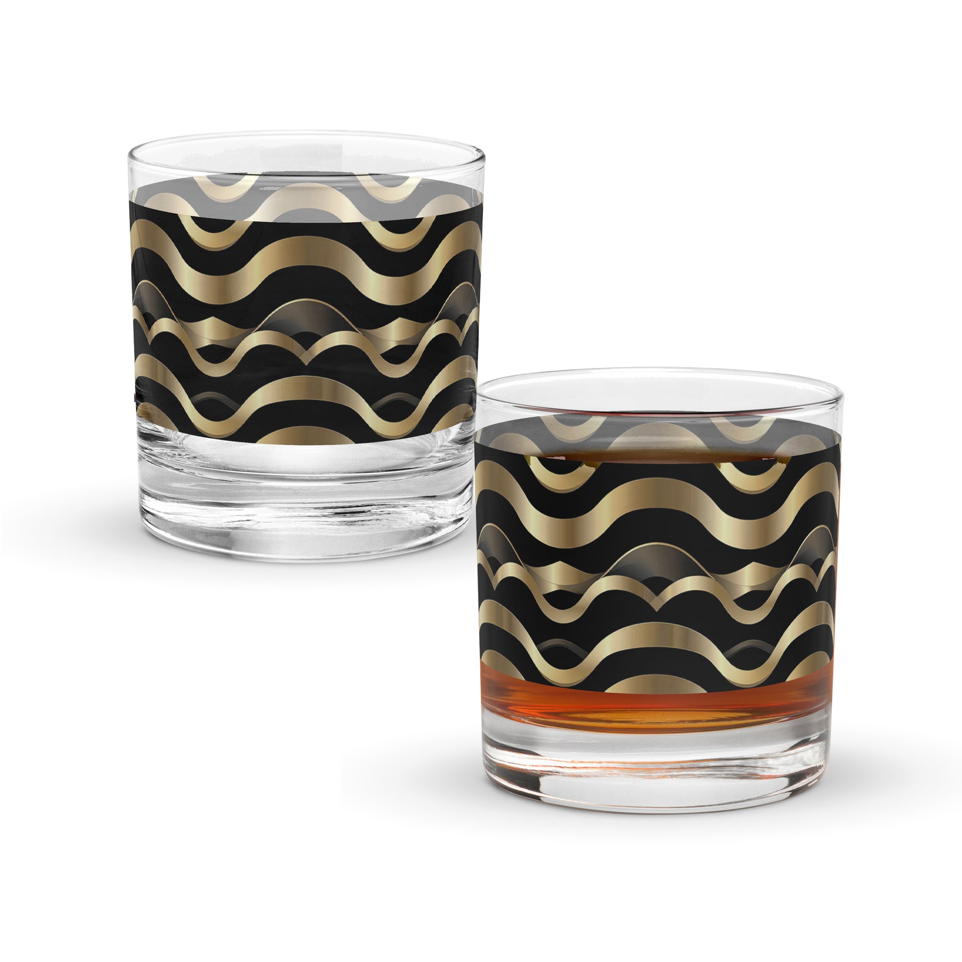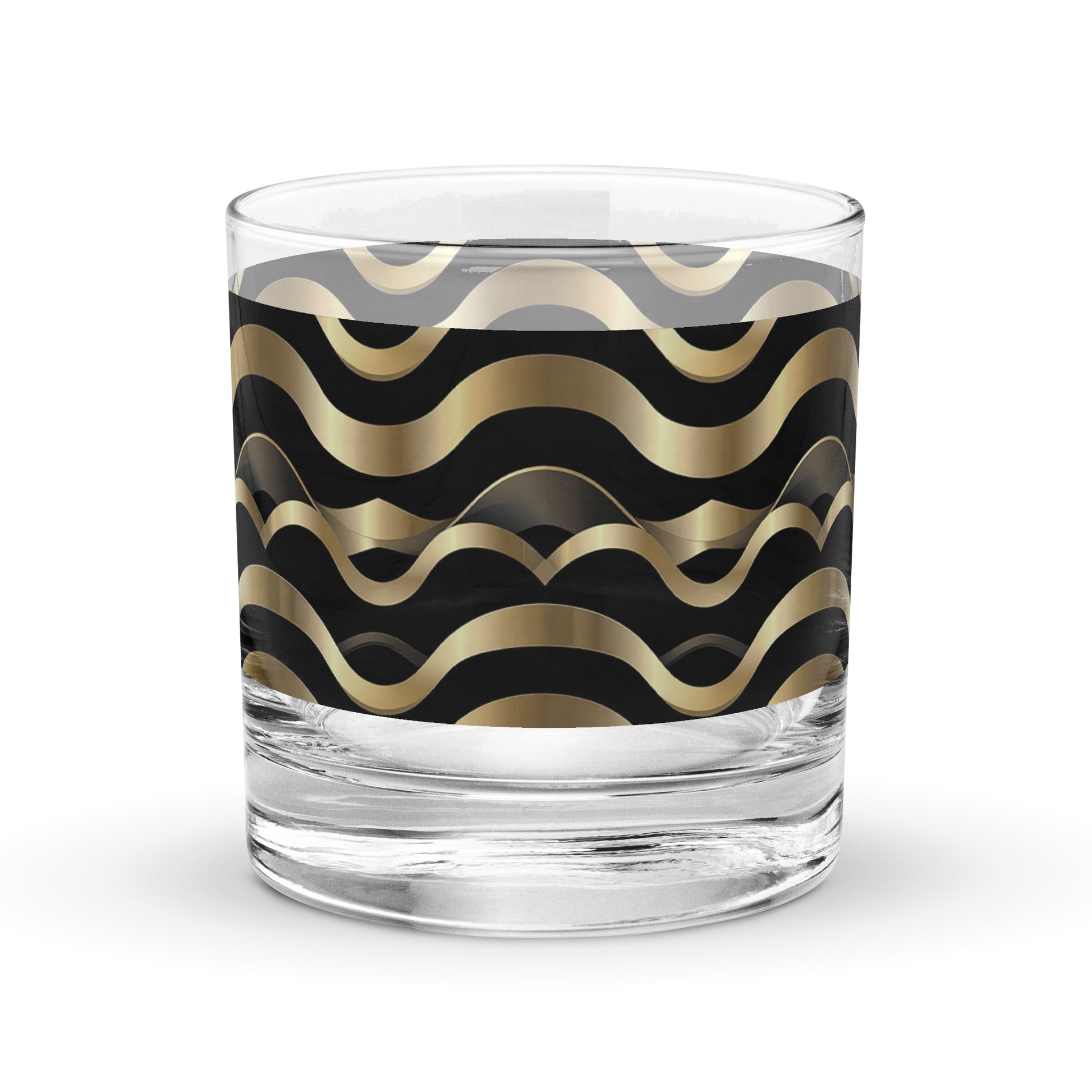 Introducing the perfect blend of style and function, our modern Liquid Gold rocks glass is designed for those who appreciate exclusive style in their everyday moments. Delight in the black and gold print that adorns this glass, bringing a touch of artistry to your sipping experience.