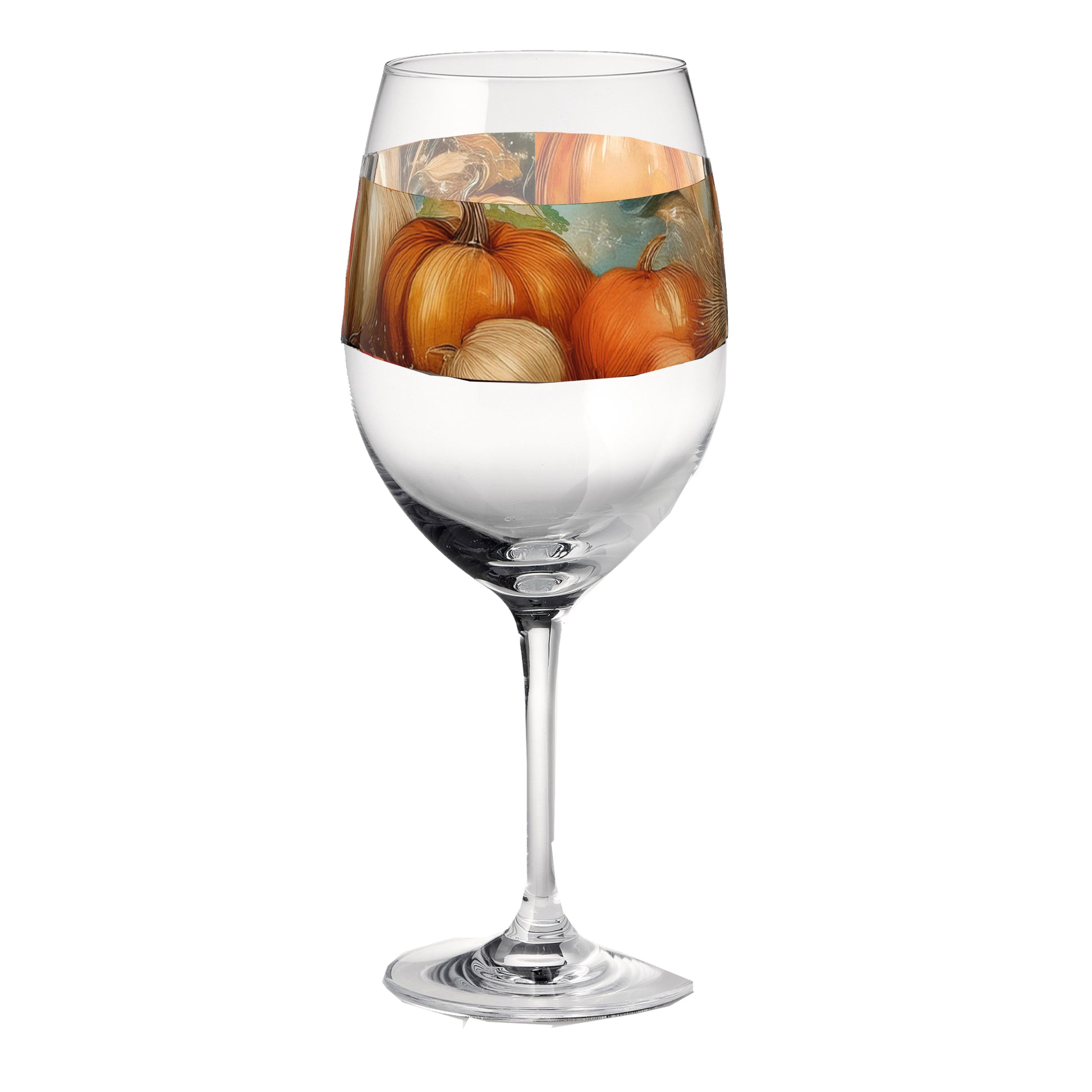 Bring the cozy, festive feeling of a perfect fall day to your sip with the Pumpkin Harvest stemmed wine glass. This warm and rustic design features a bountiful collection of pumpkins, gourds, and squash in rich, sun-baked oranges, creamy whites, and earthy yellows. The detailed artwork captures the golden light and abundant spirit of the season, making it an essential piece for your Thanksgiving table, autumn entertaining, or any evening spent wrapped up in the glow of a crisp fall night.