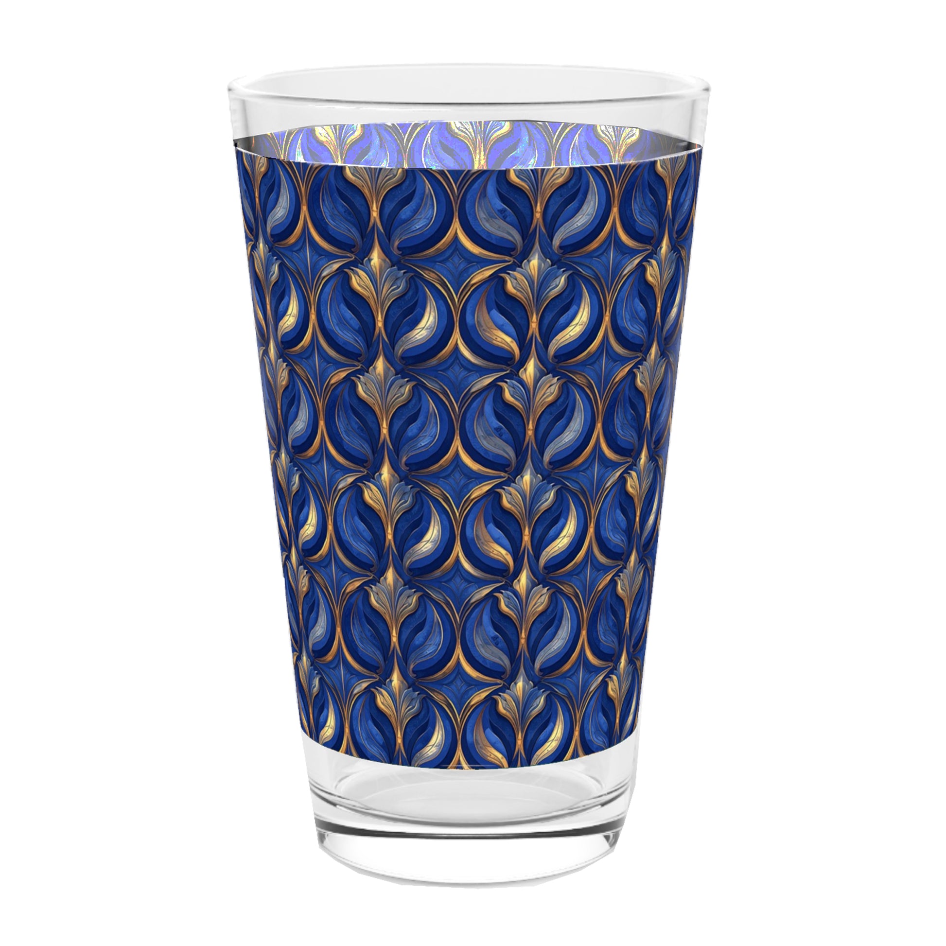 The 16 oz pint glass becomes a striking canvas for our Sapphire Oracle exclusive design. The rich sapphire backdrop and repetitive gold motifs create a mesmerizing, jewel-like effect that elevates even casual brews. With every sip, light plays through the ornate patterns, adding drama and sophistication to your entertaining experience.