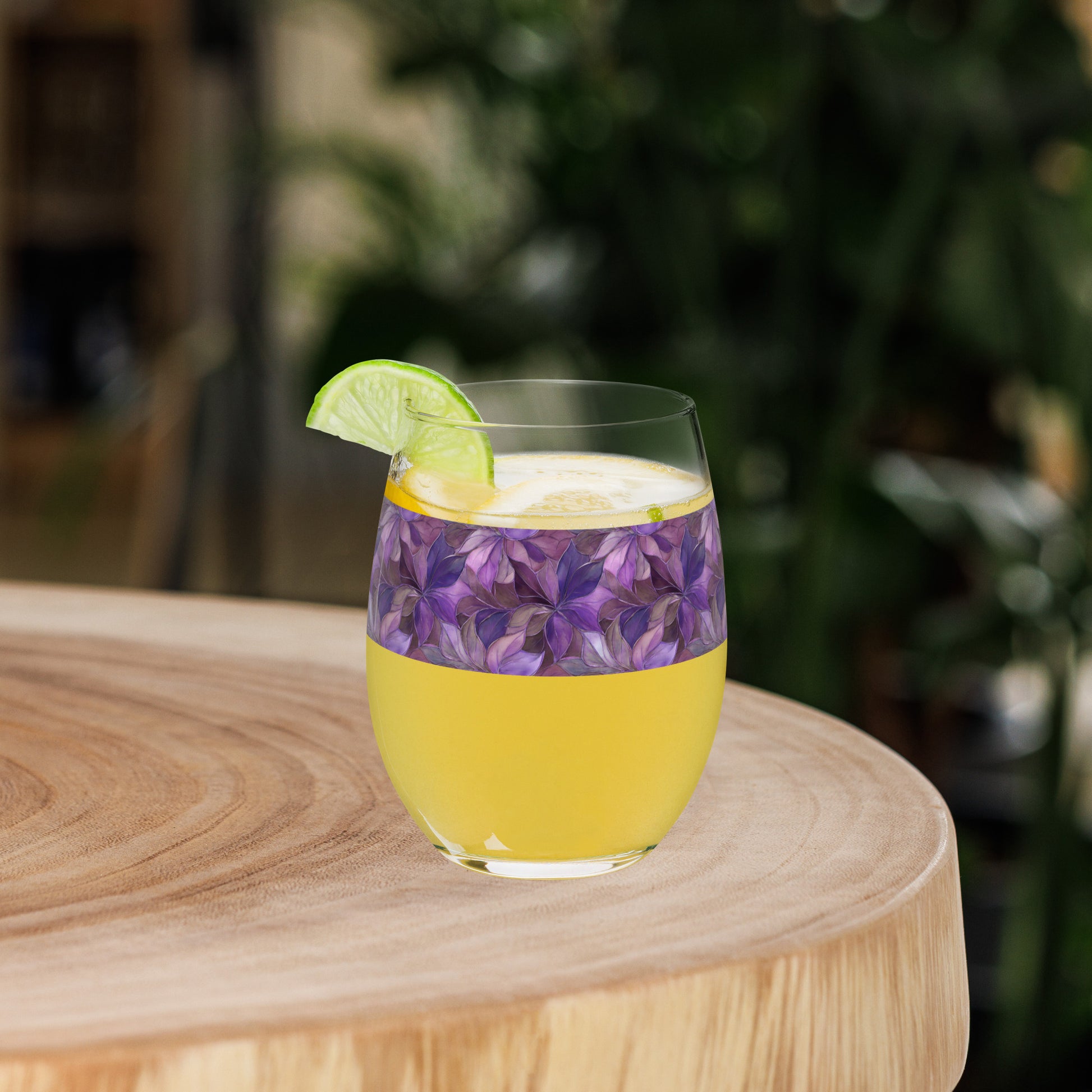 Experience the contemplative calm and rich beauty of the season with the Autumn Twilight stemless wine glass. This alluring signature design features an intricate mosaic of layered purple and mauve petals, capturing the deepening colors of a crisp fall evening and the gentle transition into twilight. The vivid, repeating pattern creates an atmosphere of cozy mystery and dramatic elegance, making this glass a stunning centerpiece for intimate autumn dinners or quiet moments of sophisticated reflection.